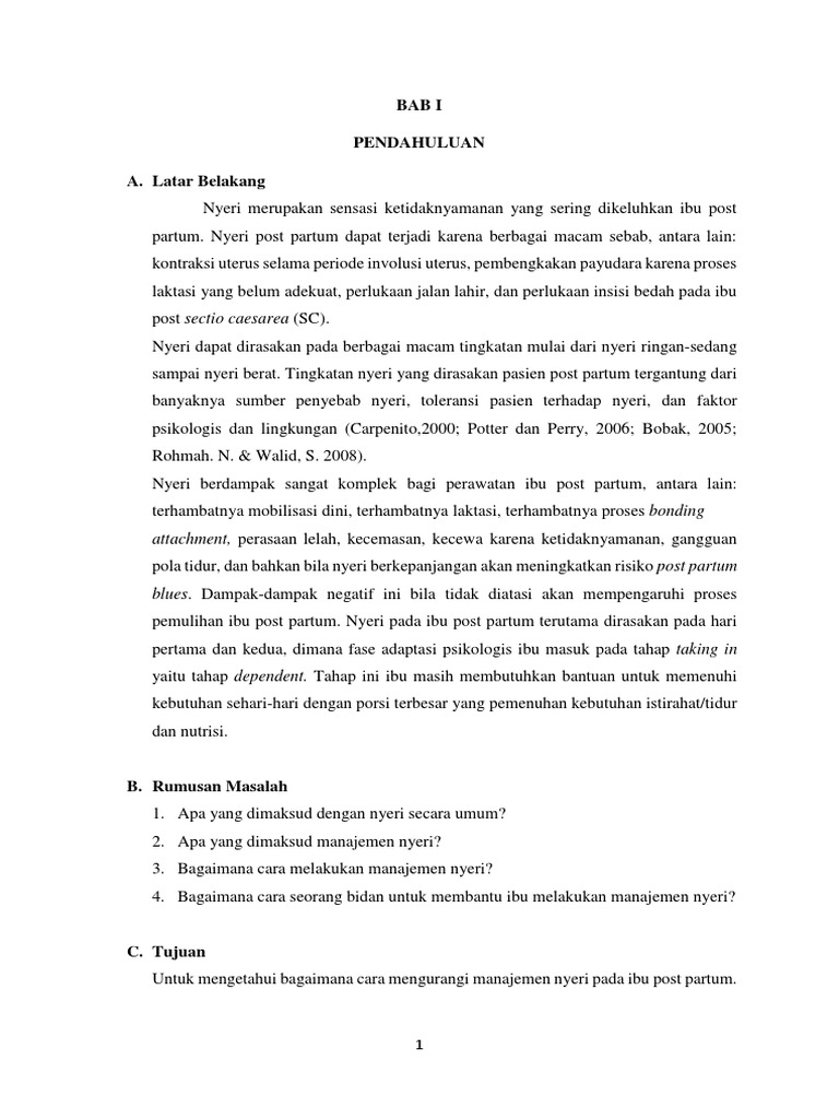 Download Full PDF Package This paper A short summary of this paper 32 Full PDFs related to this paper READ PAPER MAKALAH TUGAS MATERNITAS NYERI PERSALINAN KEMENTERIAN KESEHATAN REPUBLIK BAB I. Nyeri adalah sensori yang muncul akibat stimulus nyeri yang berupa biologis zat kimia panas listrik serta mekanik Prasetyo 2010. Skala 0 tidak nyeri Skala 1 nyeri sangat ringan Skala 2 nyeri ringanAda sensasi seperti dicubit namun tidak begitu sakit Skala 3 nyeri sudah mulai terasa namun masih bisa ditoleransi Skala 4 nyeri cukup mengganggu contoh.